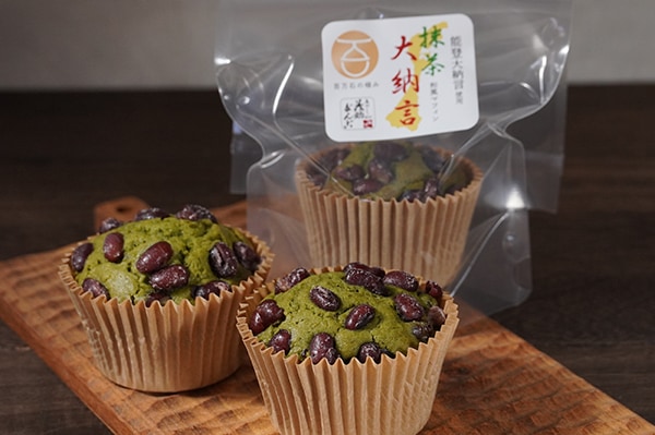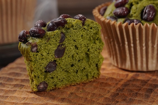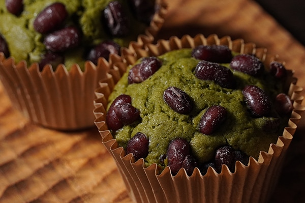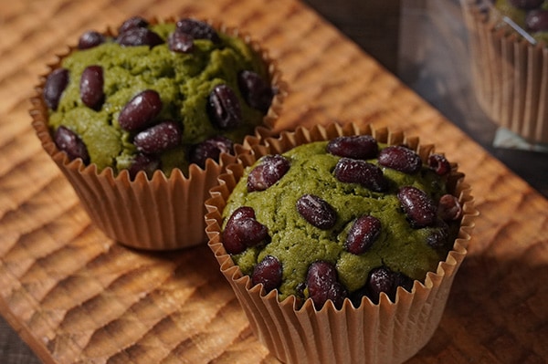 宇治抹茶のほろ苦さと、すっきりと炊き上げた能登大納言が、洋風のマフィン生地の甘さと程よいバランス。